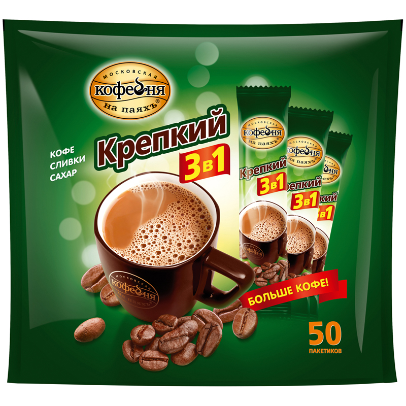 Кофе растворимый МКП "Крепкий", 3 в 1, порошкообразный, порционный, 50 пакетиков*16г, пакет