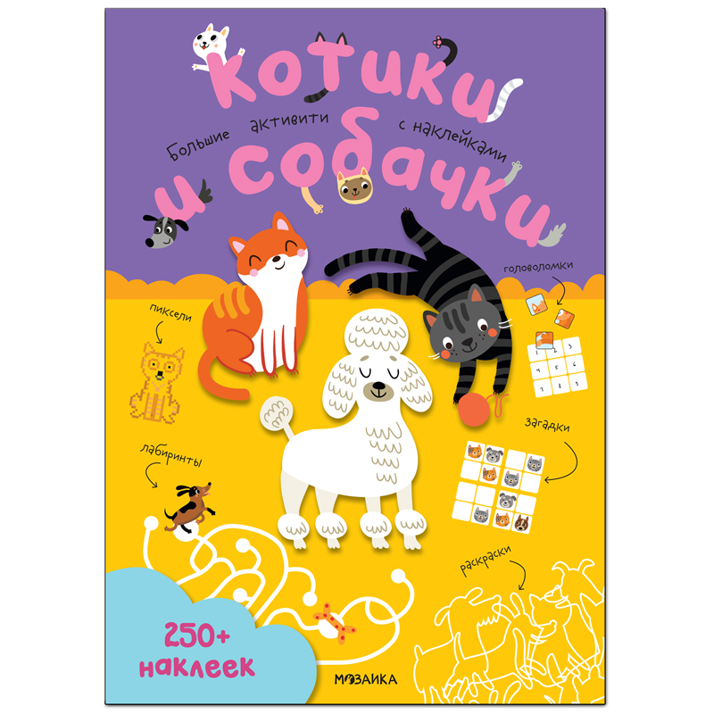 Книжка-задание, А4, Мозаика kids "Большие активити. 250 наклеек. Котики и собачки", 24стр.