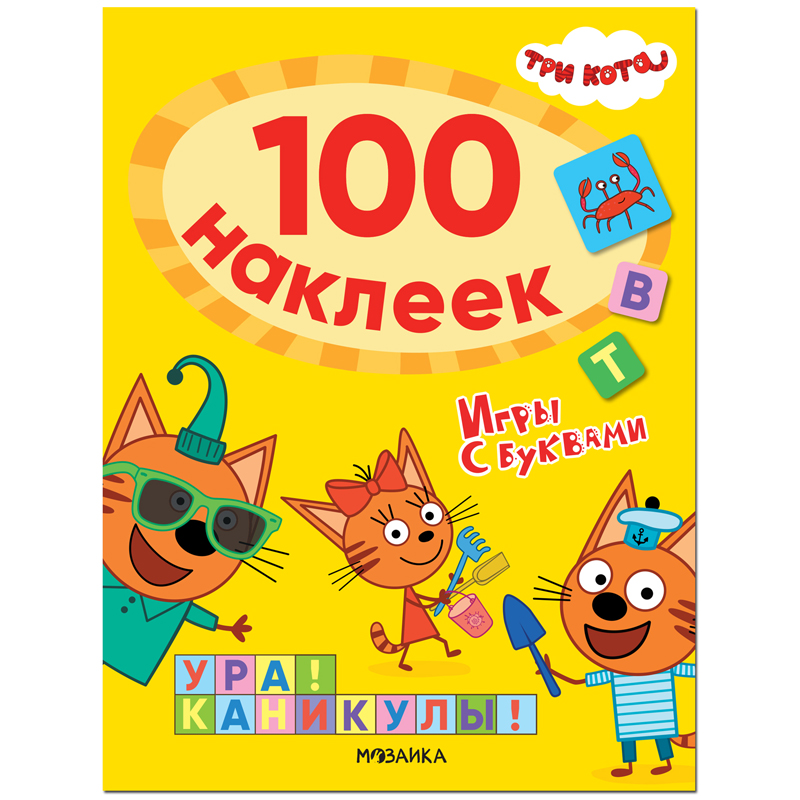 Книжка-задание Мозаика kids "Три кота. 100 наклеек. Игры с буквами. Ура! Каникулы!", 12стр.