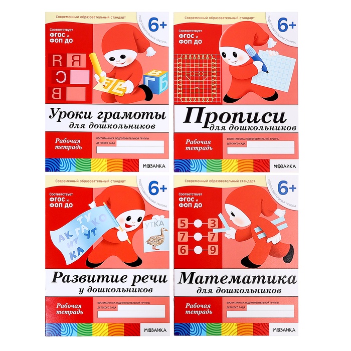 Набор рабочих тетрадей: математика, развитие речи, прописи, уроки грамоты. Подготовительная группа 6+