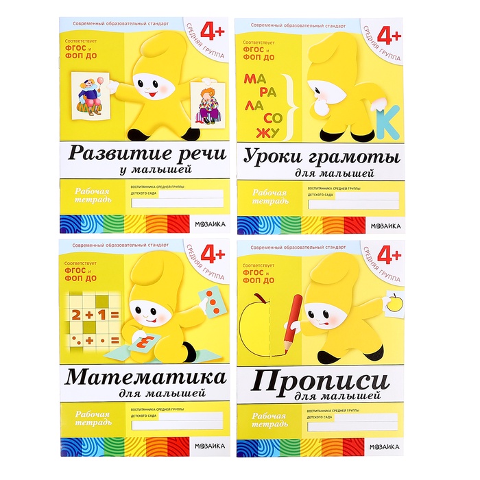 Набор рабочих тетрадей: математика, прописи, развитие речи, уроки грамоты. Средняя группа 4+