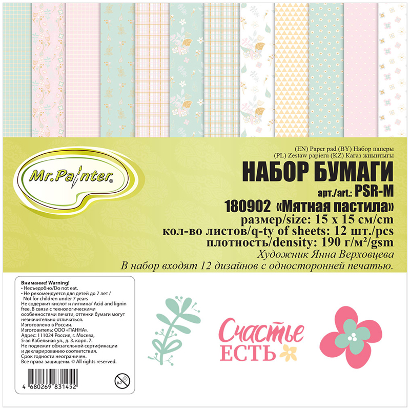 Набор бумаги для скрапбукинга Mr.Painter "Мятная пастила", 190г/м2, 15*15см, 12лист.
