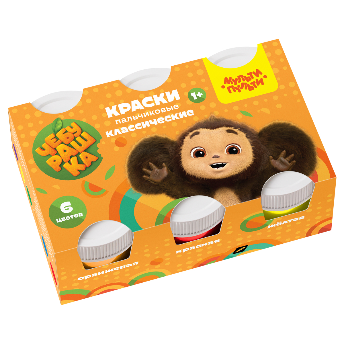 Краски пальчиковые классические с НАКЛЕЙКАМИ Мульти-Пульти "Чебурашка - Мои первые пальчиковые краски", 06 цветов, 210мл, для малышей, 1+, картон