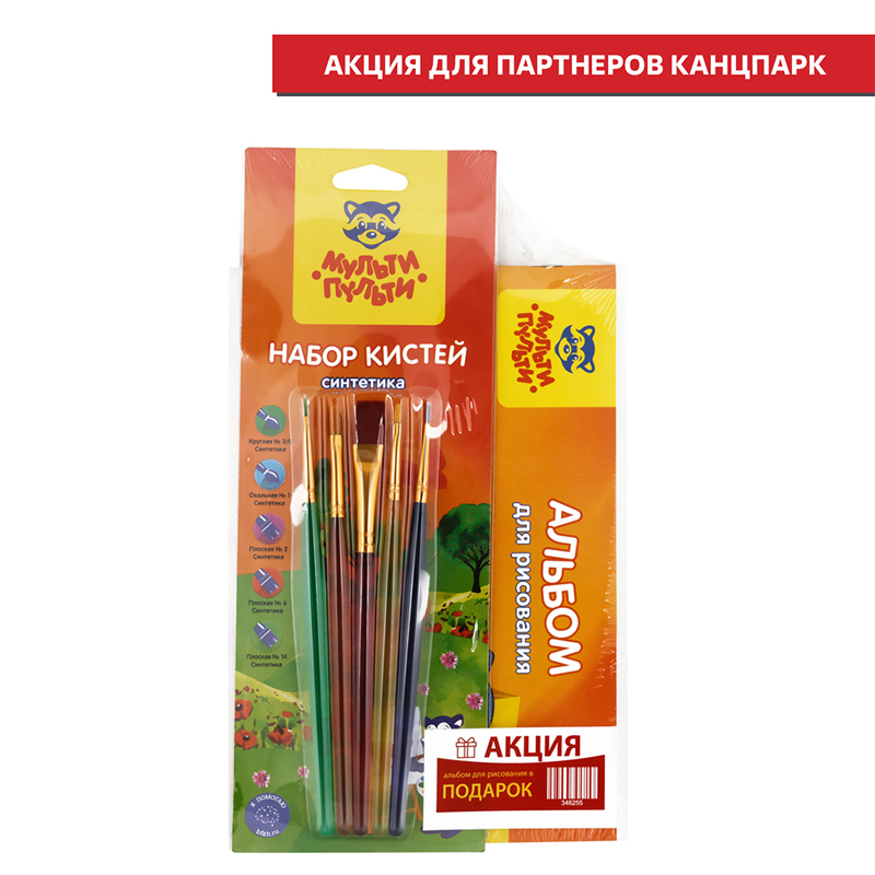 Набор кистей Мульти-Пульти 5шт., синтетика, круглая № 3, плоские № 2, 6, 14, овальная № 1, блистер + ПОДАРОК Альбом для рисования 16л., А5.