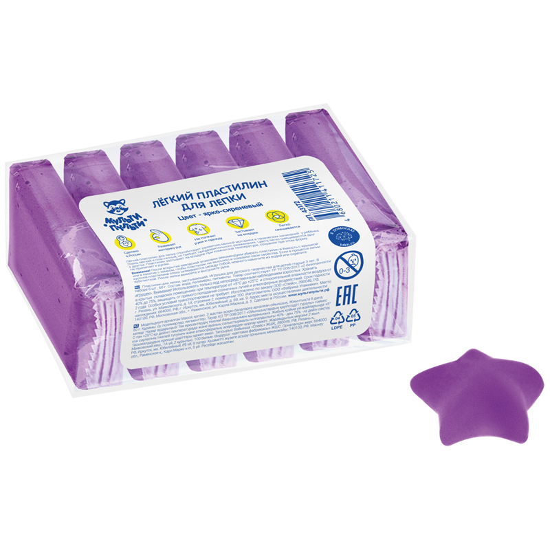 Легкий пластилин для лепки Мульти-Пульти, ярко-сиреневый, 6шт., 60г, прозрачный пакет
