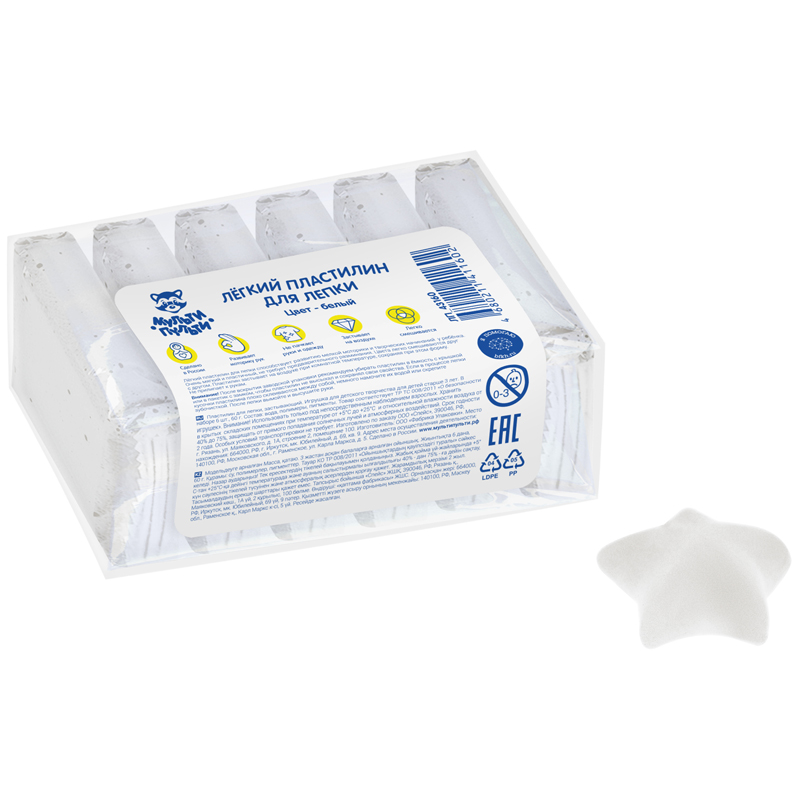 Легкий пластилин для лепки Мульти-Пульти, белый, 6шт., 60г, прозрачный пакет