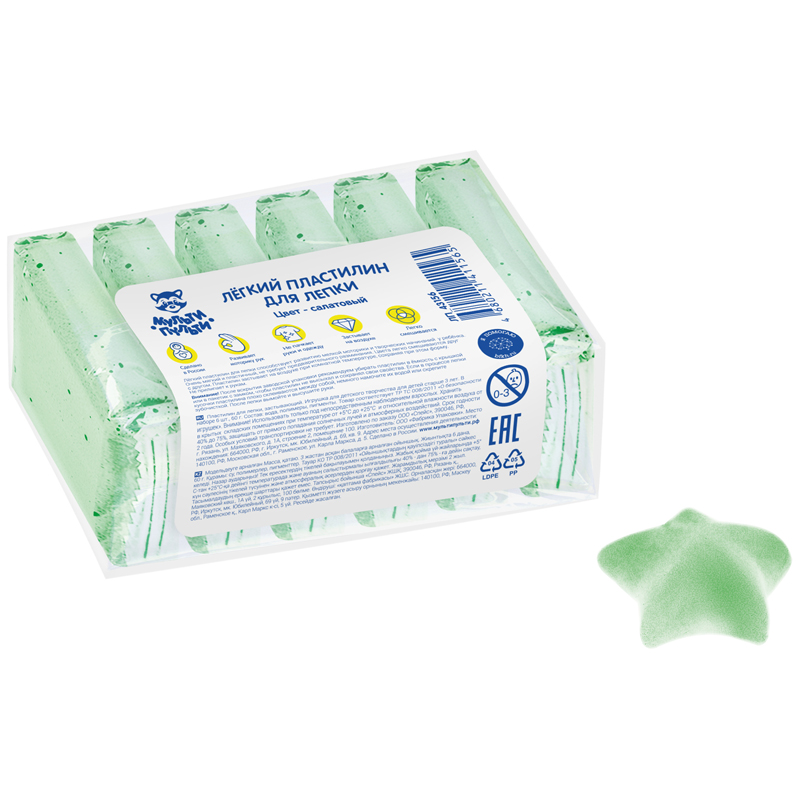 Легкий пластилин для лепки Мульти-Пульти, салатовый, 6шт., 60г, прозрачный пакет