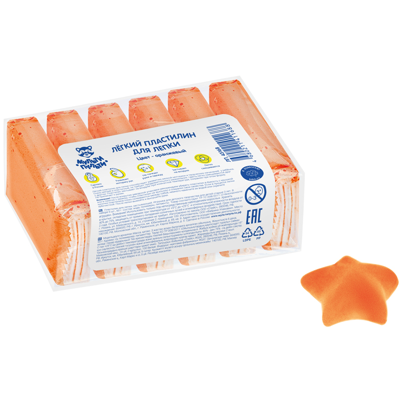 Легкий пластилин для лепки Мульти-Пульти, оранжевый, 6шт., 60г, прозрачный пакет