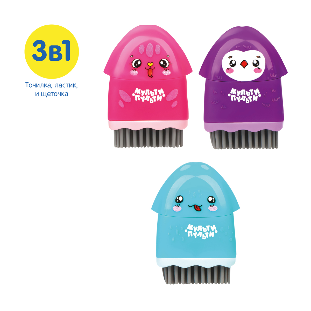 Точилка пластиковая с ластиком Мульти-Пульти "Милашки", 1 отверстие, с контейнером МИКС