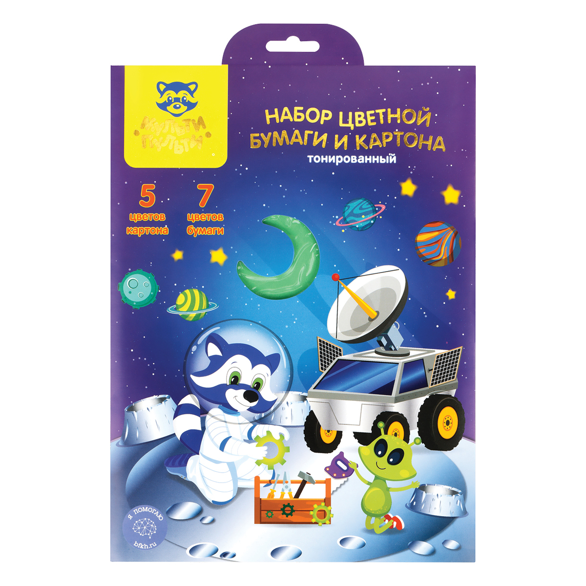 Набор А4 цв. картона, 5л., 5цв. и цв. бумаги, 7л., 7цв., Мульти-Пульти "Енот в космосе", тонированный, в папке с европодвесом