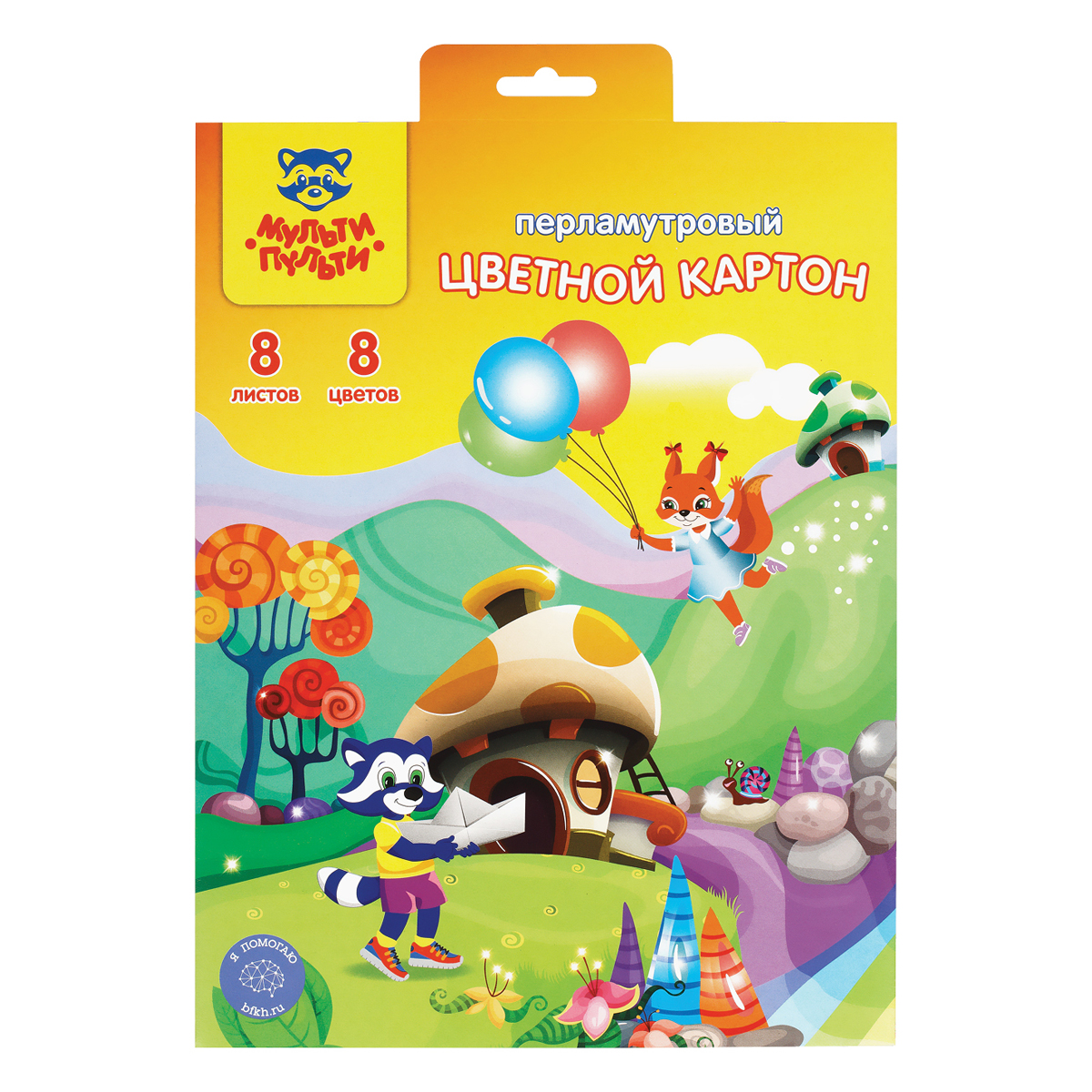 Картон цветной А4, Мульти-Пульти, 8л., 8цв., перламутровый, в папке с европодвесом, "Приключения Енота"