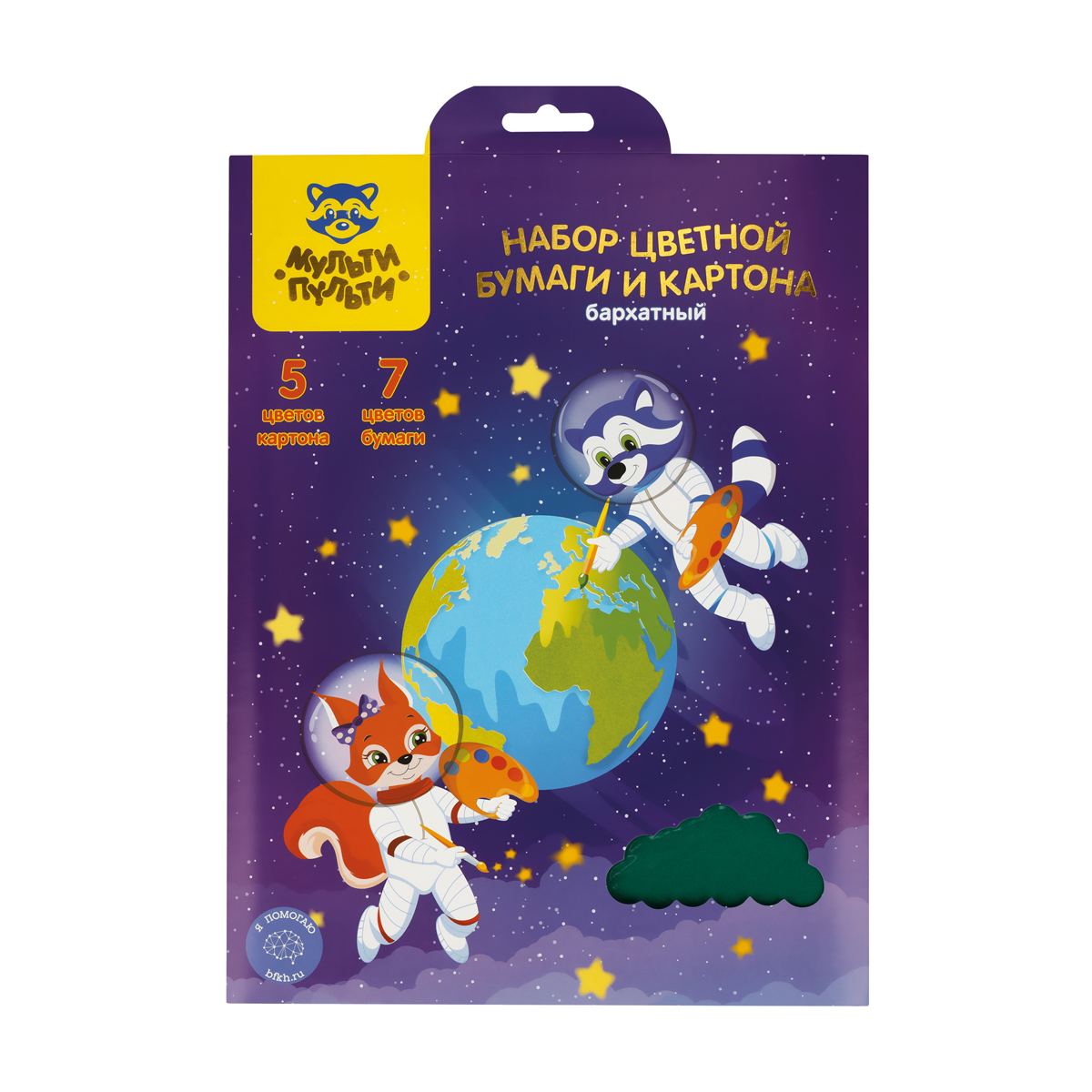 Набор А4 цв. картона, 5л., 5цв. и цв. бумаги, 7л., 7цв., Мульти-Пульти "Енот в космосе", бархатный, в папке с европодвесом