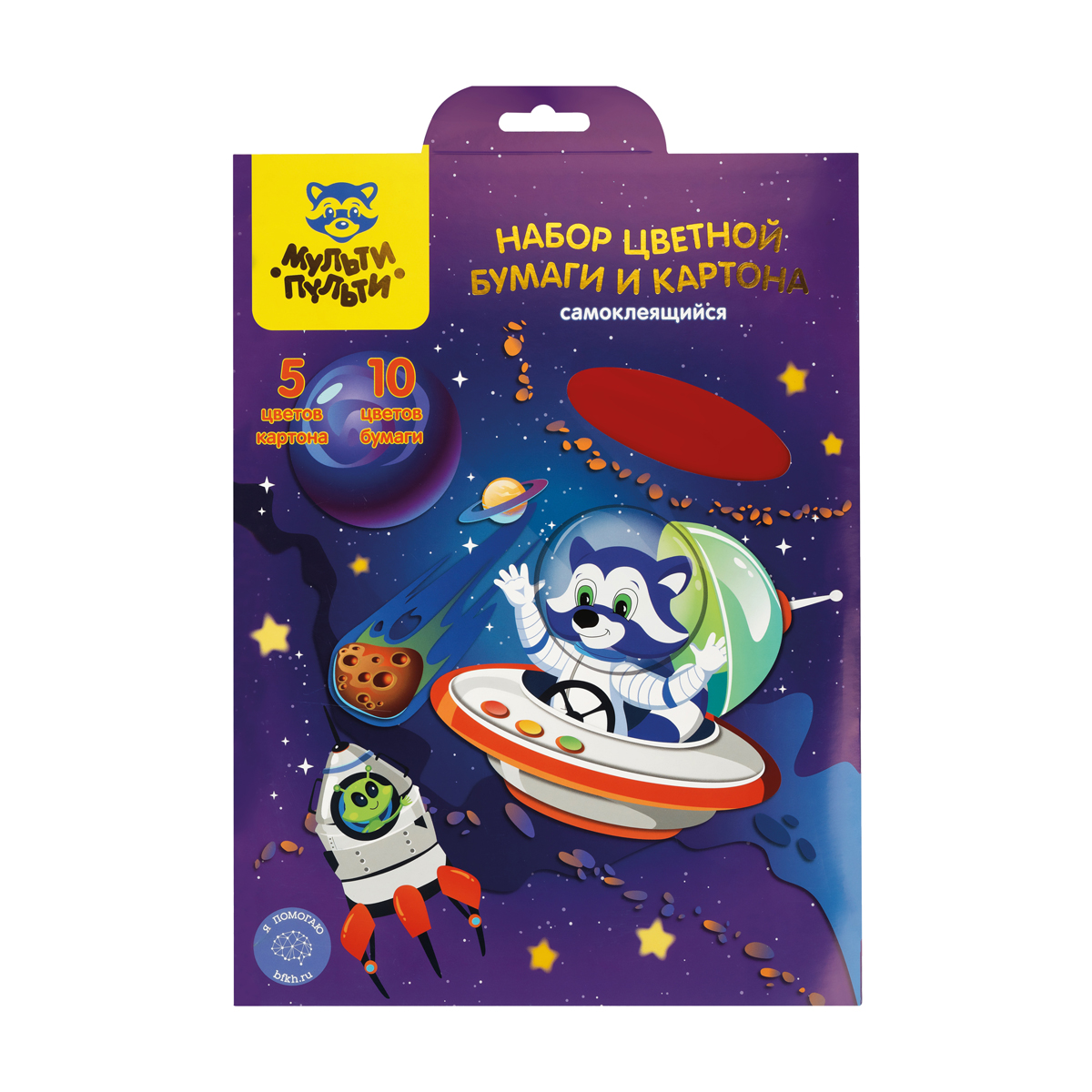 Набор А4 цв. картона, 5л., 5цв. и цв. бумаги 10л., 10цв., Мульти-Пульти "Енот в космосе", самоклеящийся, в папке с европодвесом
