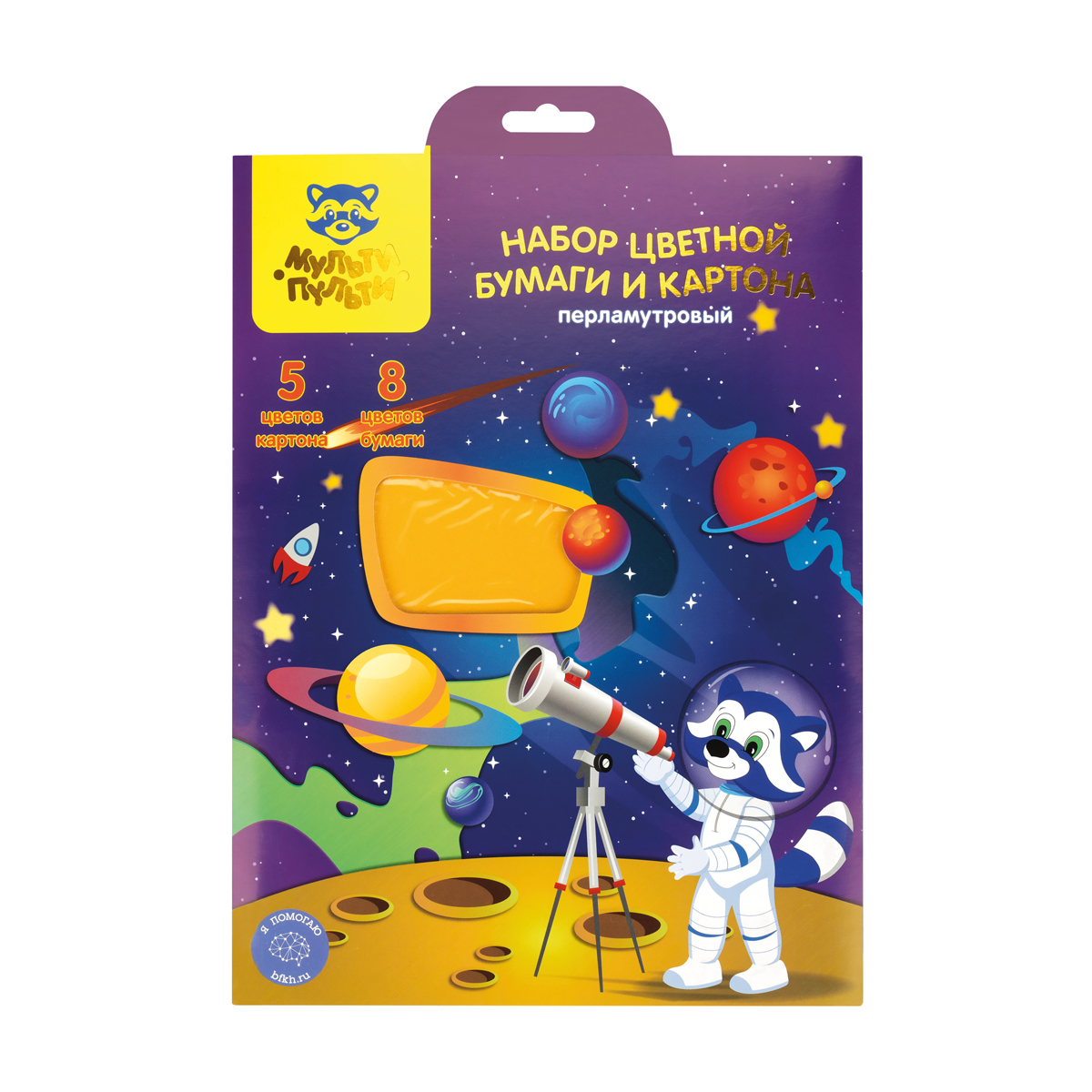 Набор А4 цв. картона, 5л., 5цв., и цв. бумаги, 8л., 8цв., Мульти-Пульти "Енот в космосе", перламутровый, в папке с европодвесом