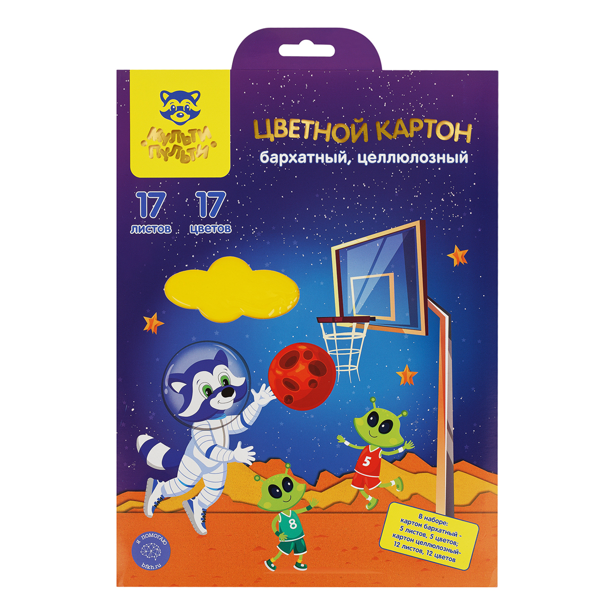 Картон цветной А4, Мульти-Пульти, микс бархатных 5л., 5цв., и целлюлозных 12л., 12цв., "Енот в космосе"