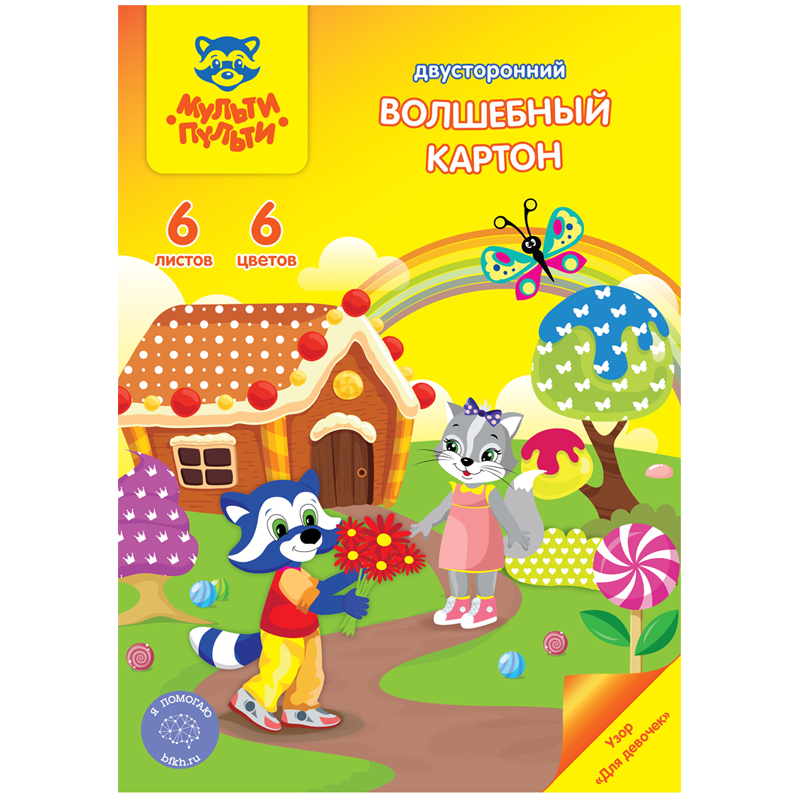 Картон цветной А4 двустор., Мульти-Пульти, 6л., 6цв., узор "Для девочек", в папке, "Енот в волшебном мире"