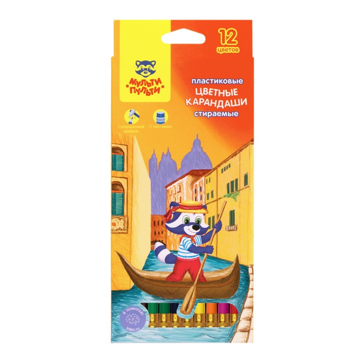 Карандаши 12 цветов Мульти-Пульти "Енот в Венеции", пластиковые, с ластиком, стираемые, картонная упаковка, европодвес