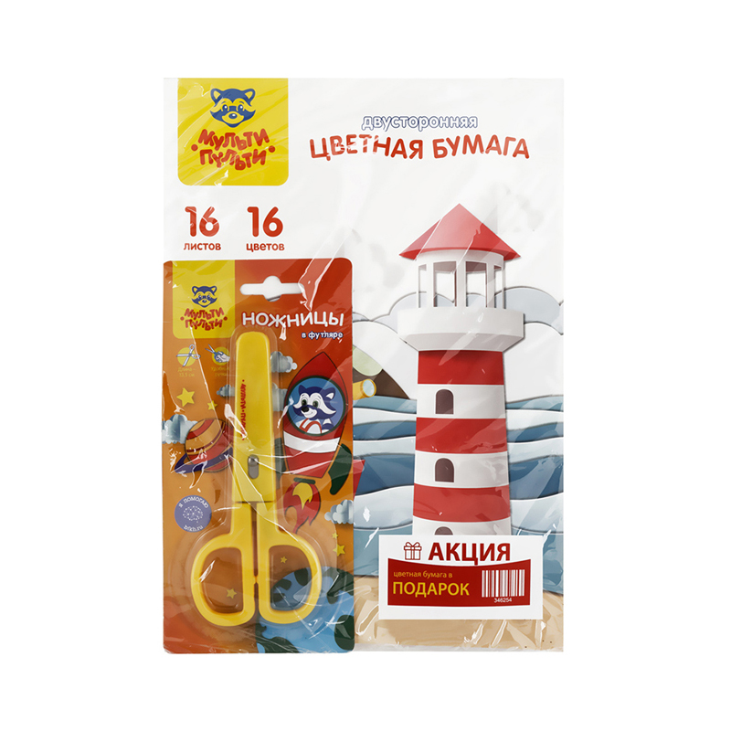 Ножницы детские Мульти-Пульти "Приключения Енота" 13,5см, в футляре, европодвес + ПОДАРОК Цветная бумага газетная А4, Мульти-Пульти