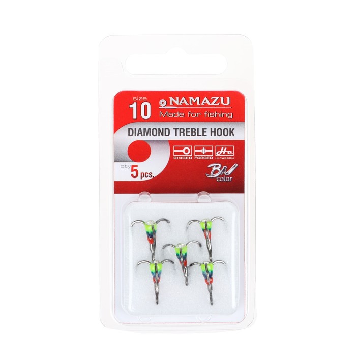 Крючок-тройник светофор Namazu, с каплей и камнем, 10 (INT), цвет GYR, в упаковке 5 шт.