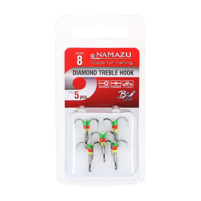 Крючок-тройник светофор Namazu, с каплей и камнем, 8 (INT), цвет GRO, в упаковке 5 шт.