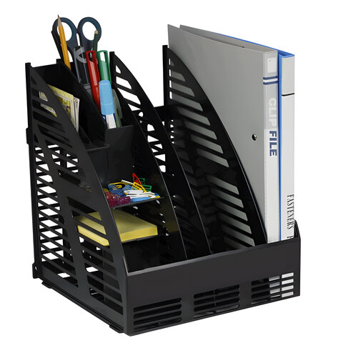 Лоток вертикальный для бумаг (240х240х300 мм), 3 отделения, сборный, с органайзером, черный, 4С143