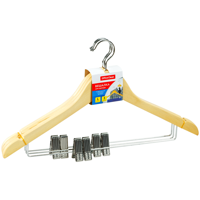 Вешалка-плечики OfficeClean, набор 3шт., деревянная, металлическая перекладина, клипсы для брюк, 45см, цвет сосна