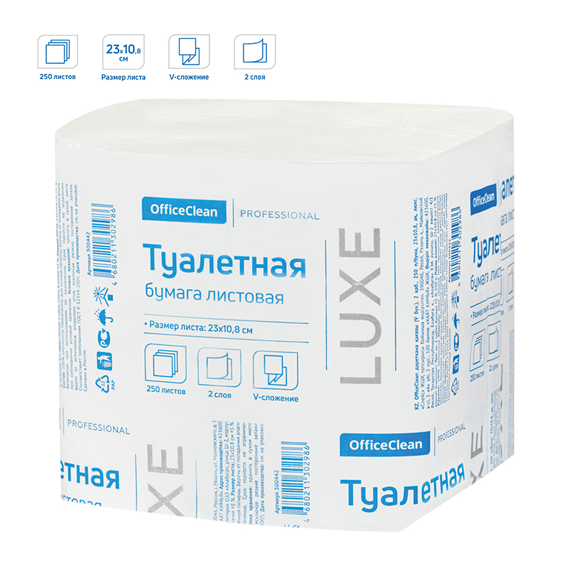 Бумага туалетная листовая OfficeClean Professional (V-сл)(T3), 2-слойная, 250лист./пачка, белая