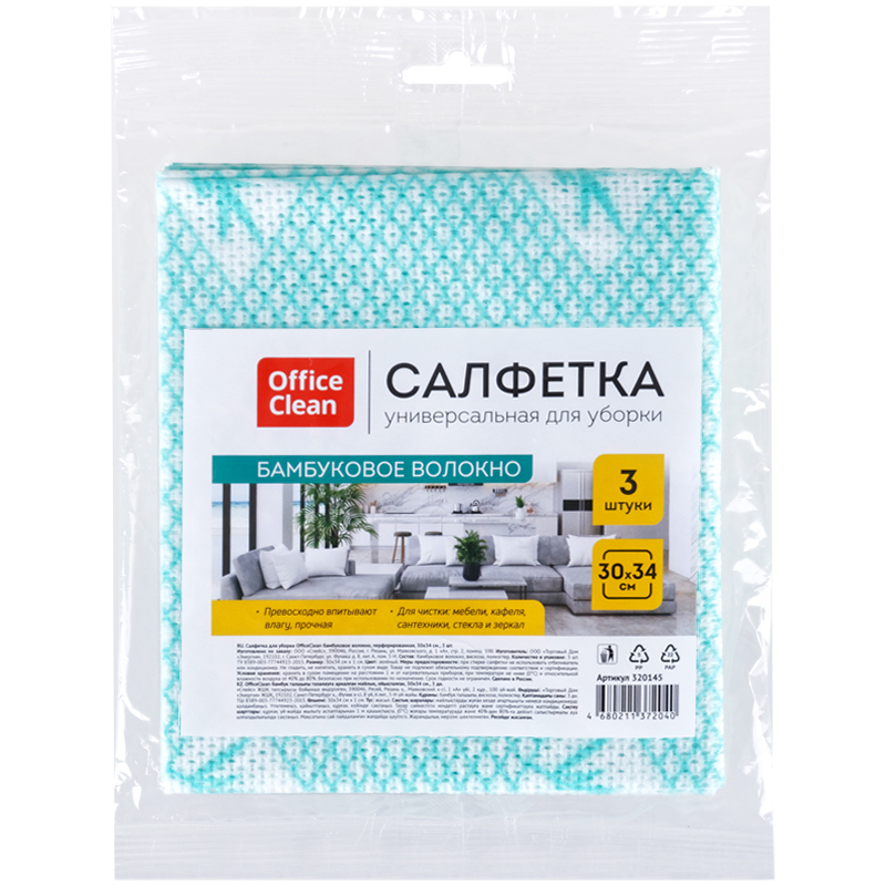 Салфетки для уборки OfficeClean, 3шт., бамбуковое волокно, перфорированные, 30*34см