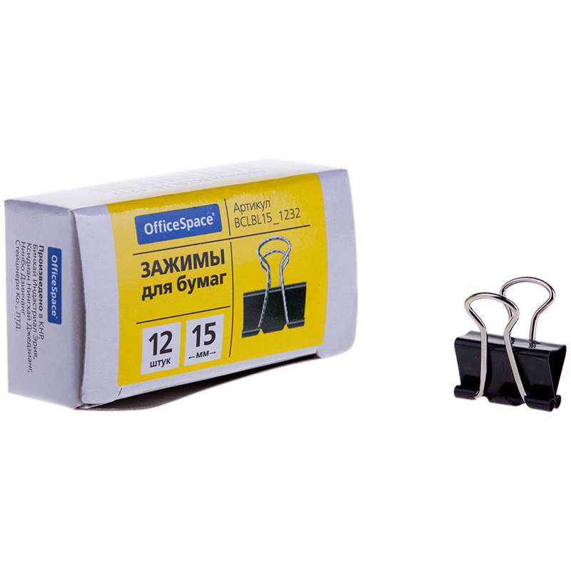 Зажимы для бумаг 15мм, OfficeSpace, 12шт., черные, картонная коробка