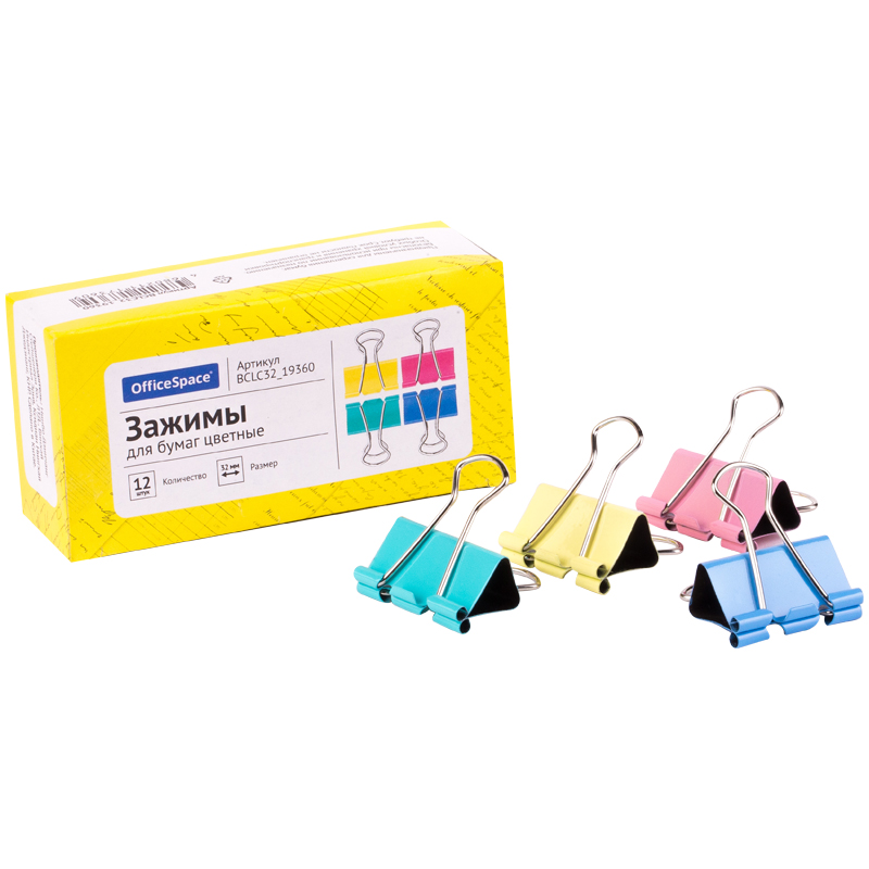 Зажимы для бумаг 32мм, OfficeSpace, 12шт., цветные, картонная коробка