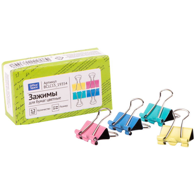 Зажимы для бумаг 15мм, OfficeSpace, 12шт., цветные, картонная коробка