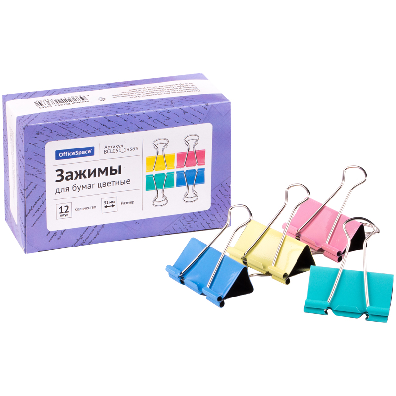 Зажимы для бумаг 19мм, OfficeSpace, 12шт., цветные, картонная коробка