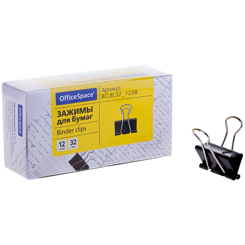 Зажимы для бумаг 32мм, OfficeSpace, 12шт., черные, картонная коробка