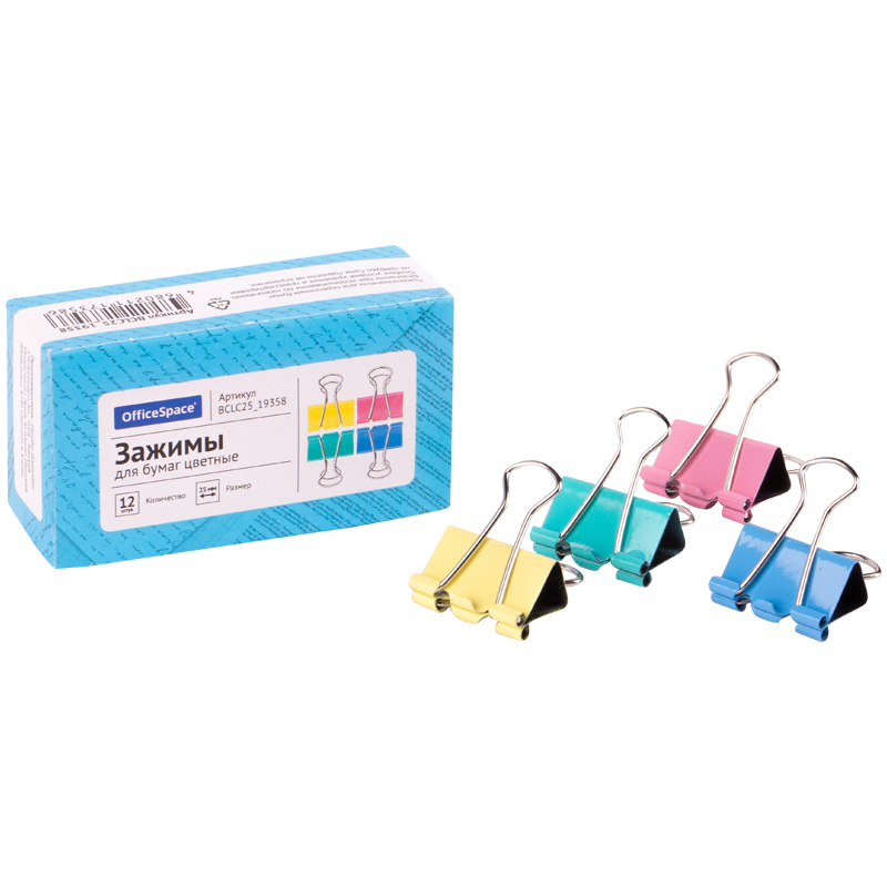 Зажимы для бумаг 25мм, OfficeSpace, 12шт., цветные, картонная коробка