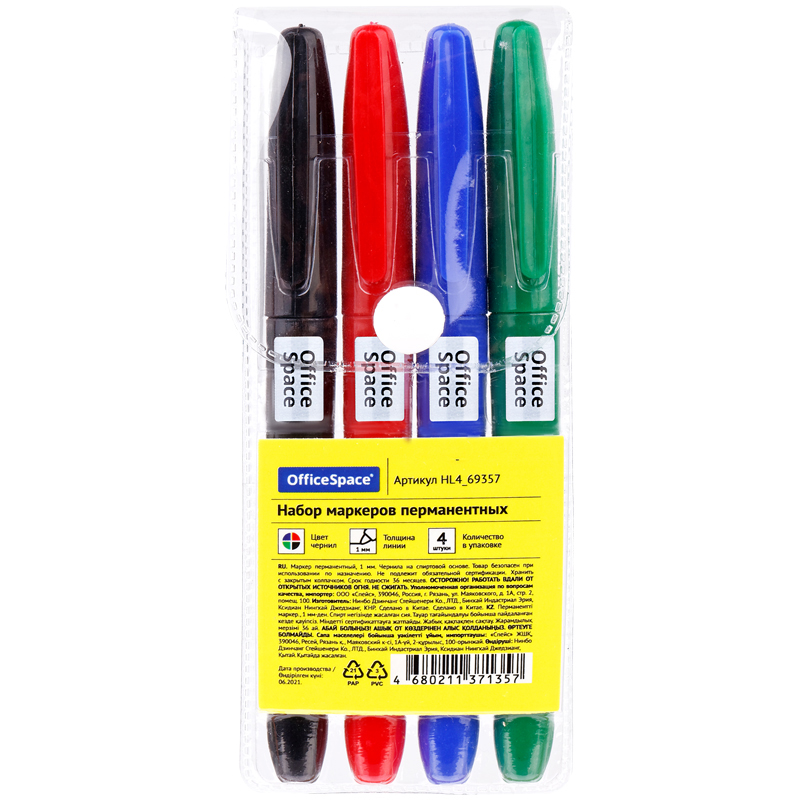 Набор маркеров перманентных OfficeSpace 04цв., пулевидный, 1мм, чехол с европодвесом