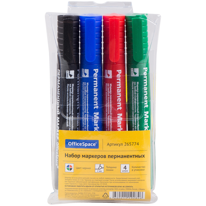 Набор маркеров перманентных OfficeSpace "8004" 04цв., пулевидный, 2мм, чехол с европодвесом