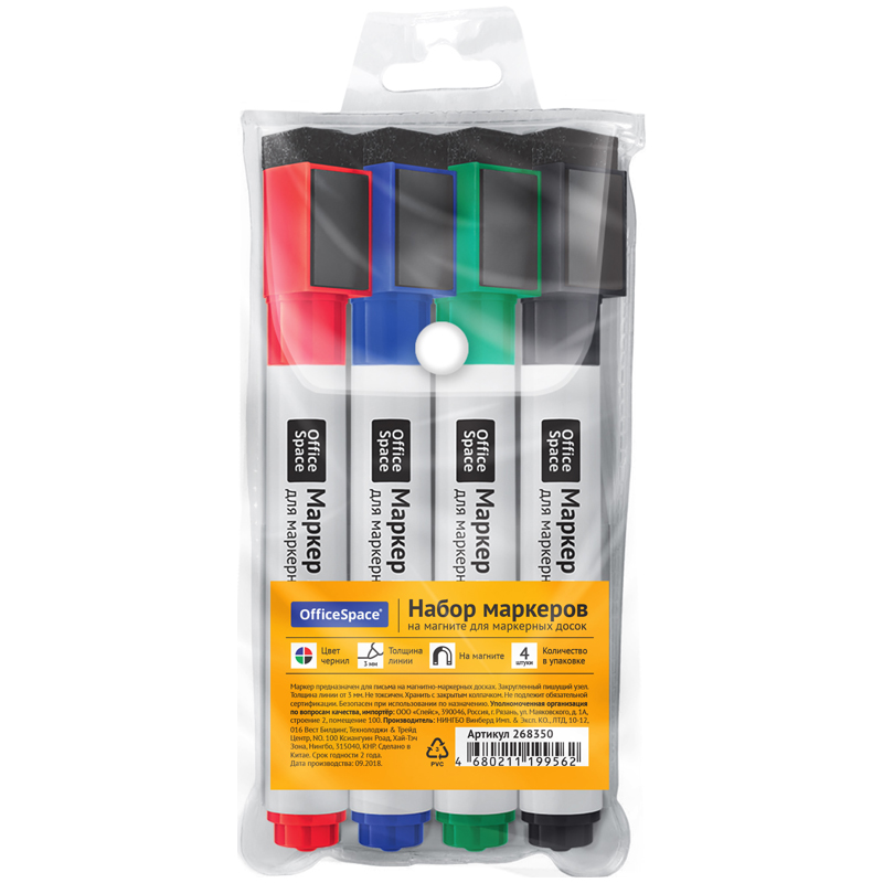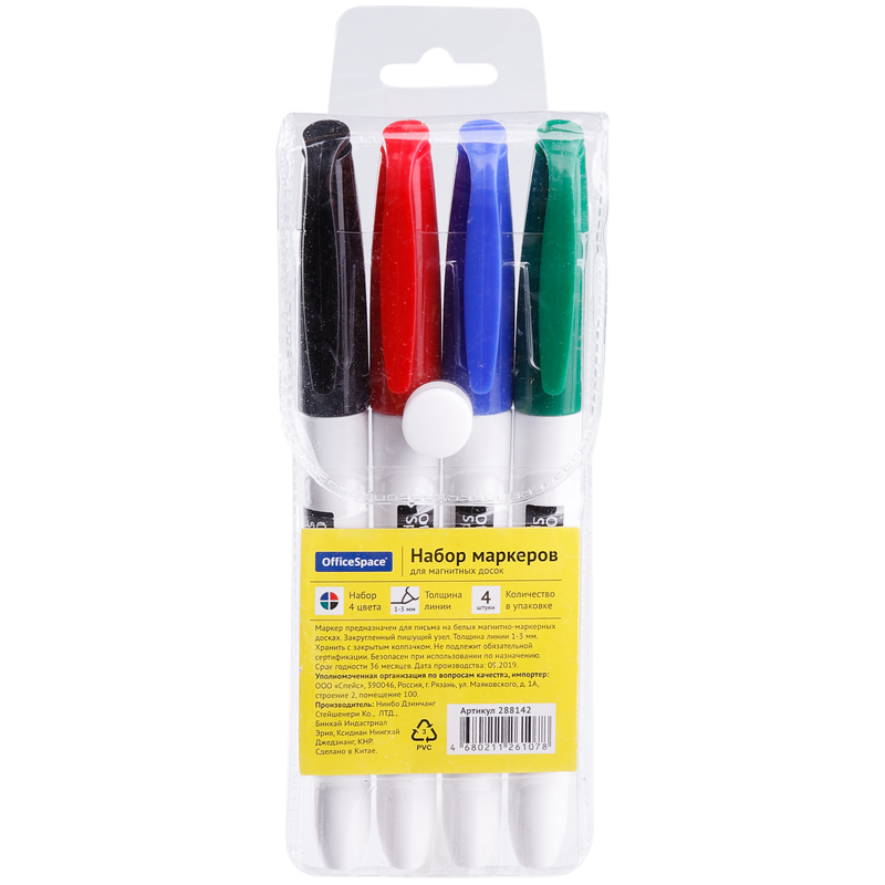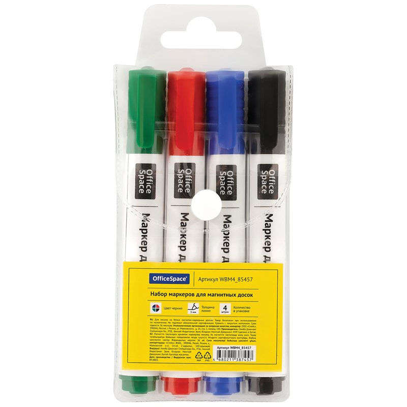 Набор маркеров для белых досок на магнитах OfficeSpace 04цв., пулевидный, 3мм, чехол с европодвесом