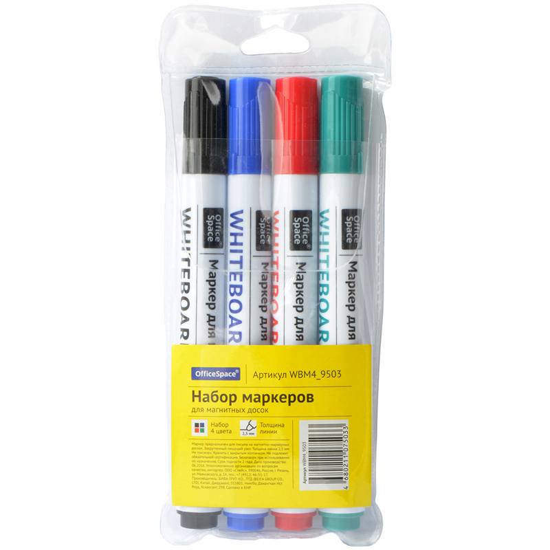 Набор маркеров для белых досок OfficeSpace 04цв., пулевидный, 2,5мм, чехол с европодвесом
