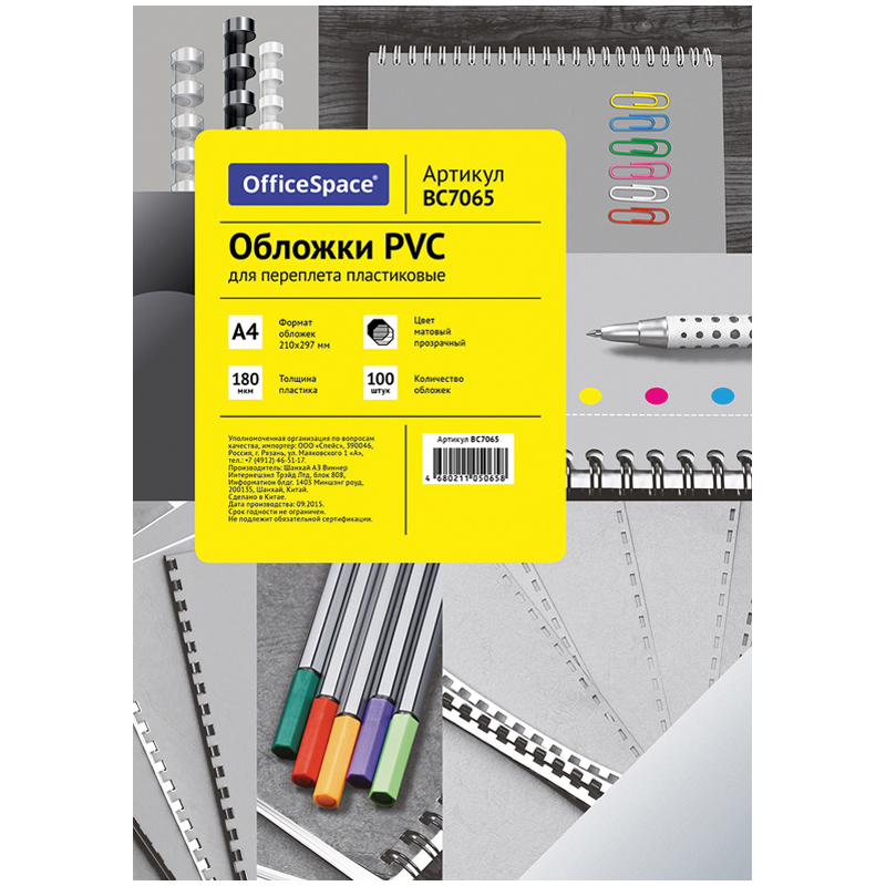 Обложка А4 OfficeSpace "PVC" 180мкм, прозрачный матовый пластик, 100л.