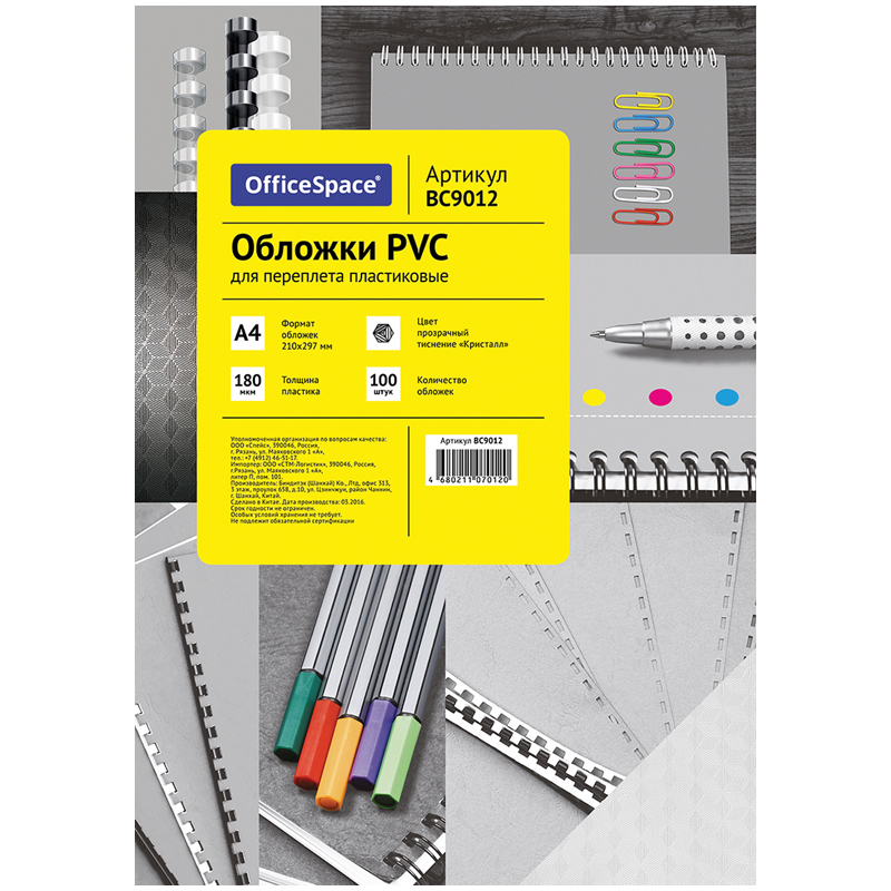 Обложка А4 OfficeSpace "PVC" 180мкм, прозрачный бесцветный пластик, 100л.