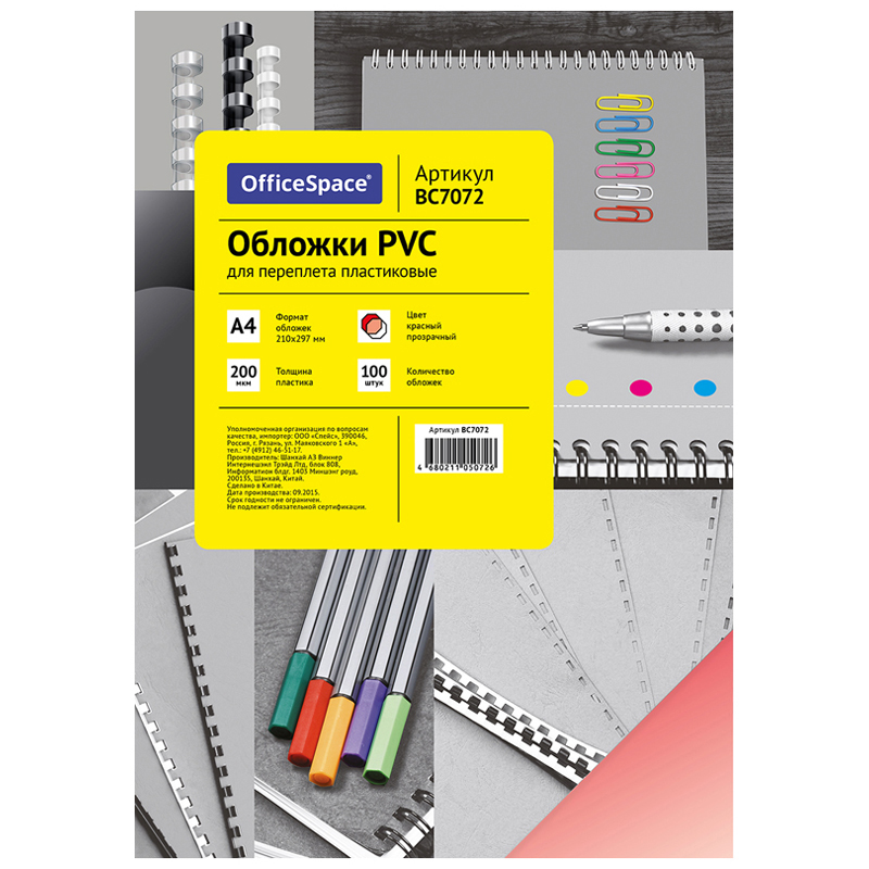 Обложка А4 OfficeSpace "PVC" 200мкм, прозрачный красный пластик, 100л.