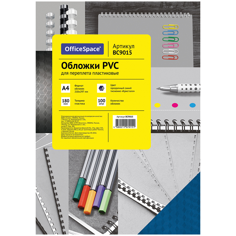 Обложка А4 OfficeSpace "PVC" 180мкм, "Кристалл" прозрачный синий пластик, 100л.