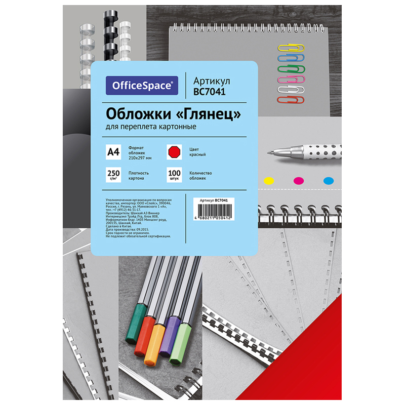 Обложка А4 OfficeSpace "Глянец" 250г/кв.м, красный картон, 100л.