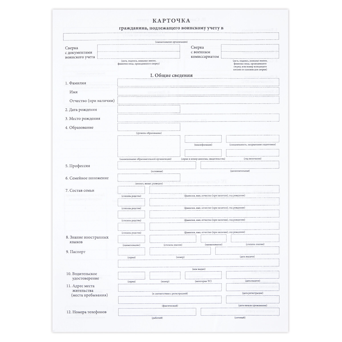 Бланк Карточка гражданина подлежащего воинскому учету (форма № 10), А4, офсет, 100 экз., в пленке т/у