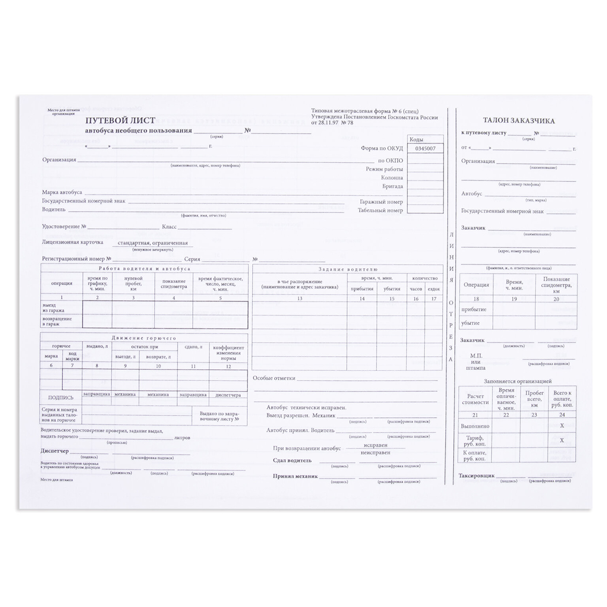 Бланк Путевой лист автобуса необщего пользования (форма №6), А4, офсет, 100 экз., в пленке т/у