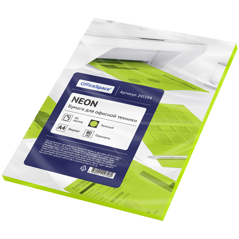 Бумага цветная OfficeSpace neon А4, 80г/м2, 50л. (зеленый)