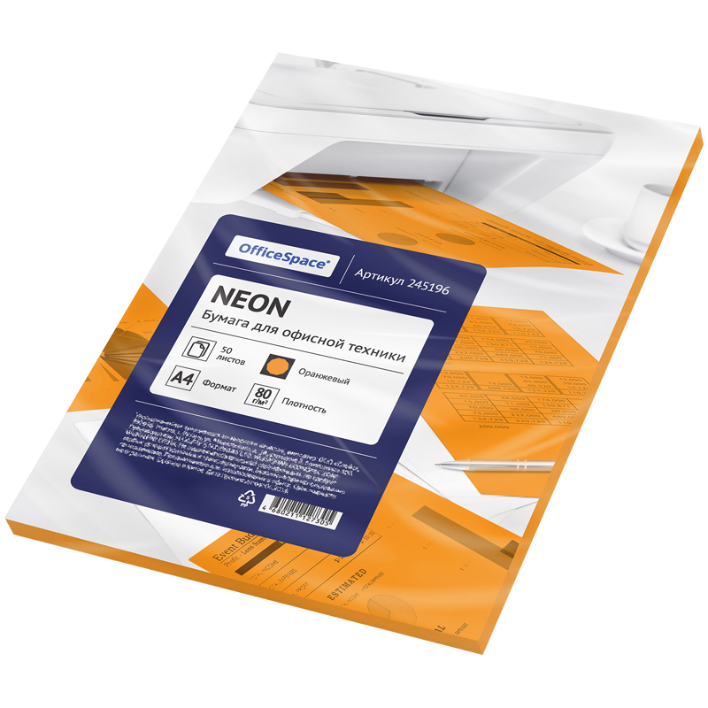Бумага цветная OfficeSpace neon А4, 80г/м2, 50л. (оранжевый)