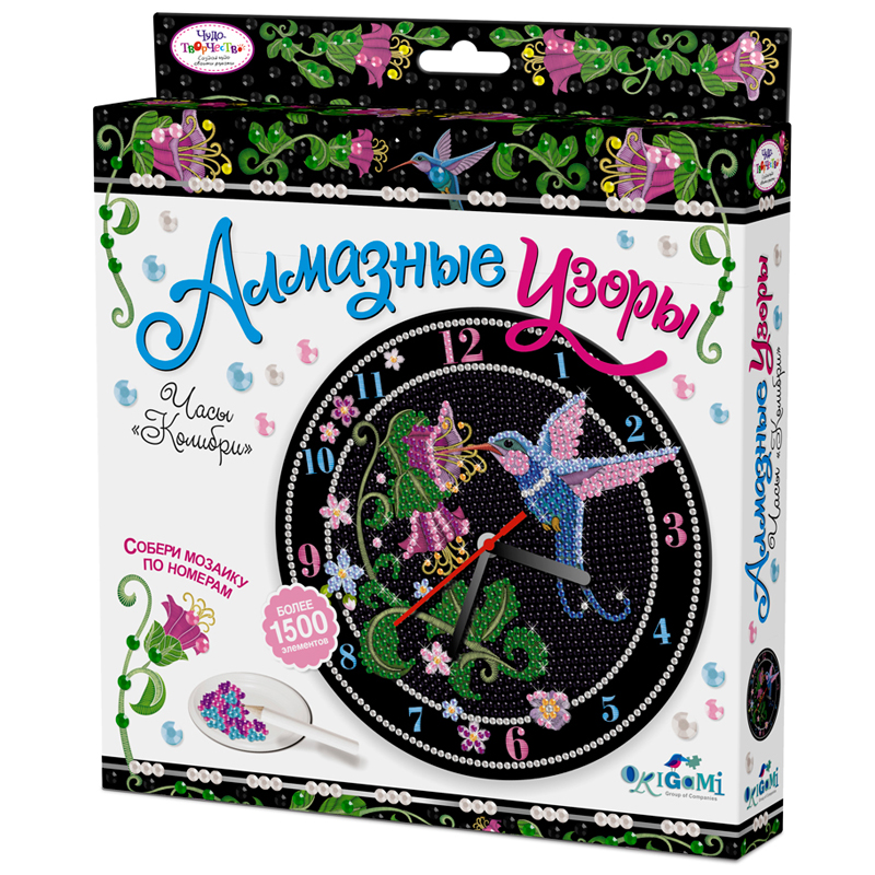 Алмазная мозаика Origami "Алмазные узоры. Часы. Колибри", d20см, европодвес