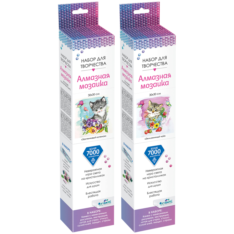 Алмазная мозаика Origami "Алмазные узоры. Застенчивый котенок/Земляничный чай", 30*30см, ассорти, европодвес
