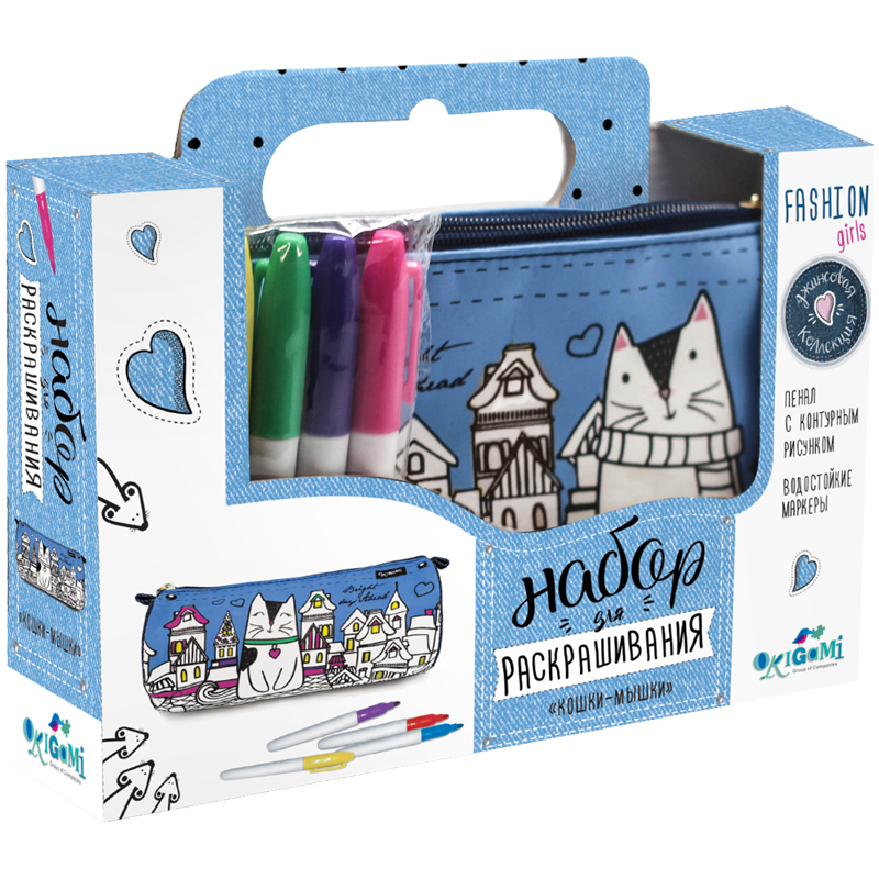 Набор для раскрашивания пенала Origami "Джинсовая коллекция. Кошки-мышки", водостойкие маркеры 6цв.